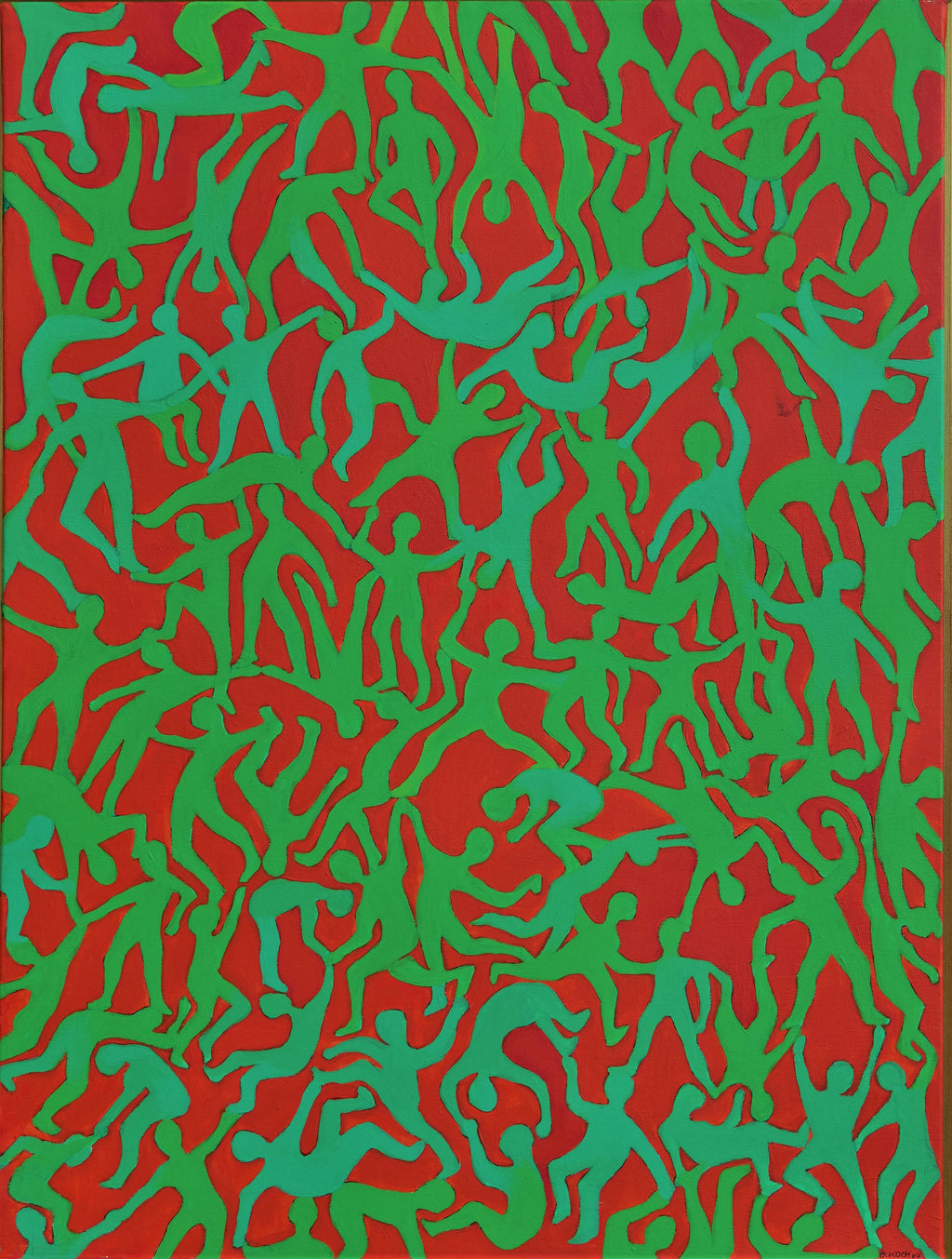 The colors green and red irritate the eye of the viewer. Just this play of colors I have deliberately brought to the canvas. The picture shows many figures that are connected to each other and result in this pattern.